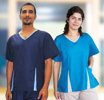 This modern tri-tone coloured scrub top has a contrast wrap v-neck line, a matching band and two different body colours. It is available in a range of colour options and colours can be custom made according to your preferences.